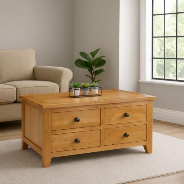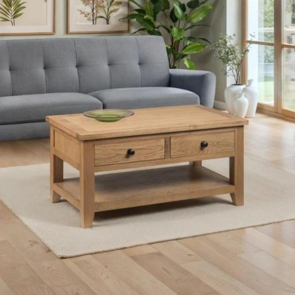 Description: Indulge in the timeless charm of the Astoria 4 Drawer Coffee Table, a versatile masterpiece meticulously crafted from White Oak and Oak Veneers, boasting a durable waxed finish. This elegant piece seamlessly blends into both contemporary and traditional interior styles, thanks to its classic design and chunky tops that exude sophistication.