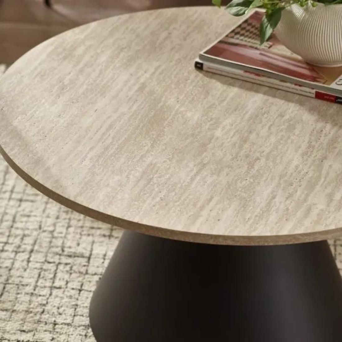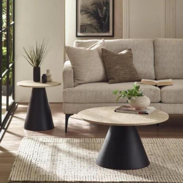 Description: Introduce sculptural elegance to your living room with this modern coffee and lamp table set. Featuring travertine-effect tops and bold conical pedestal bases, each piece blends tactile texture with clean architectural form. The powder-coated black metal bases create striking contrast and ensure long-lasting durability, while the soft stone-look surface brings a refined, natural feel. Perfect for styling with décor accents like vases, books, or plants, the two sizes offer flexible placement and layered visual interest in lounges and open-plan spaces.